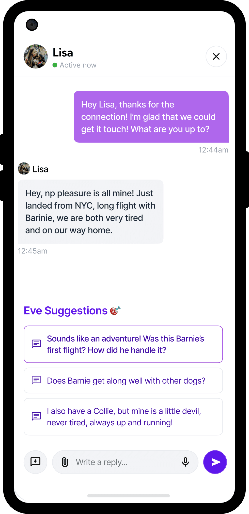 Eve isn’t one-size-fits-all, she gets to know you and your pet. Over time, she learns your routines, preferences and needs to create a curated journey within our Offleash’d community.Whether it’s helping you meet new people, providing nutrition advice, training tips or fun new activities, Eve tailors her guidance so you always feel supported and confident.